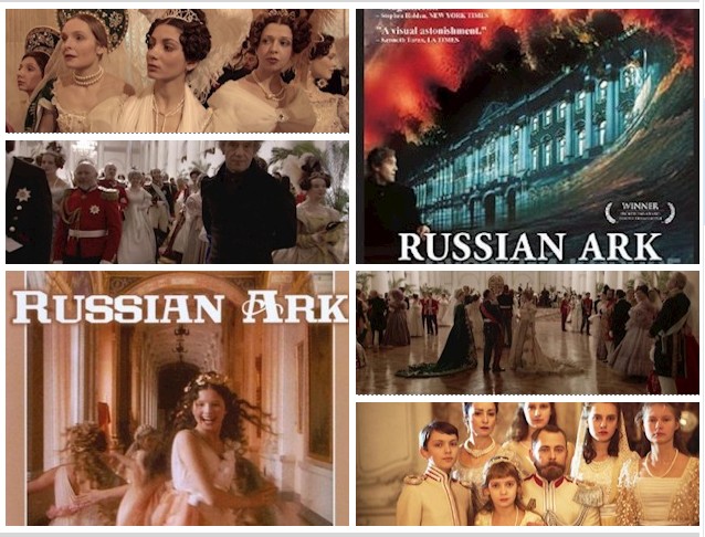 "أفتح عيني ولا أرى شيئا.. كل ما أتذكره هو أنه حدثت هناك بعض الحوادث..ركض الجميع للحفاظ على حياتهم قدر استطاعتهم.. أما بالنسبة لما حدث لي فلا أتذكر شيئا" ؛ بهذه الكلمات الغامضة المنشورة تباعا على شاشة سوداء والمسموعة بصوت شخص غير مرئي، يبدأ الفيلم الروسي "السفينة الروسية" أو (سفينة نوح الروسية 2002 )، ويتلوها مشهد لجمهرة من الرجال والنساء في ازياء، ربما من القرن التاسع عشر، وهم يندفعون صاخبين للدخول إلى متحف الأرميتاج الروسي الشهير لحضور حفل، ثم في مشهد مذهل، تدخل الكاميرا قاعة فخمة حيث مئات الراقصين، بملابسهم الفاخرة ومجوهراتهم، يرقصون على أنغام أوركسترا سيمفونية، وتبدو الكاميرا وكأنها تطفو في الهواء نحو مسرح الأوركسترا، وتتحرك بين الموسيقيين.