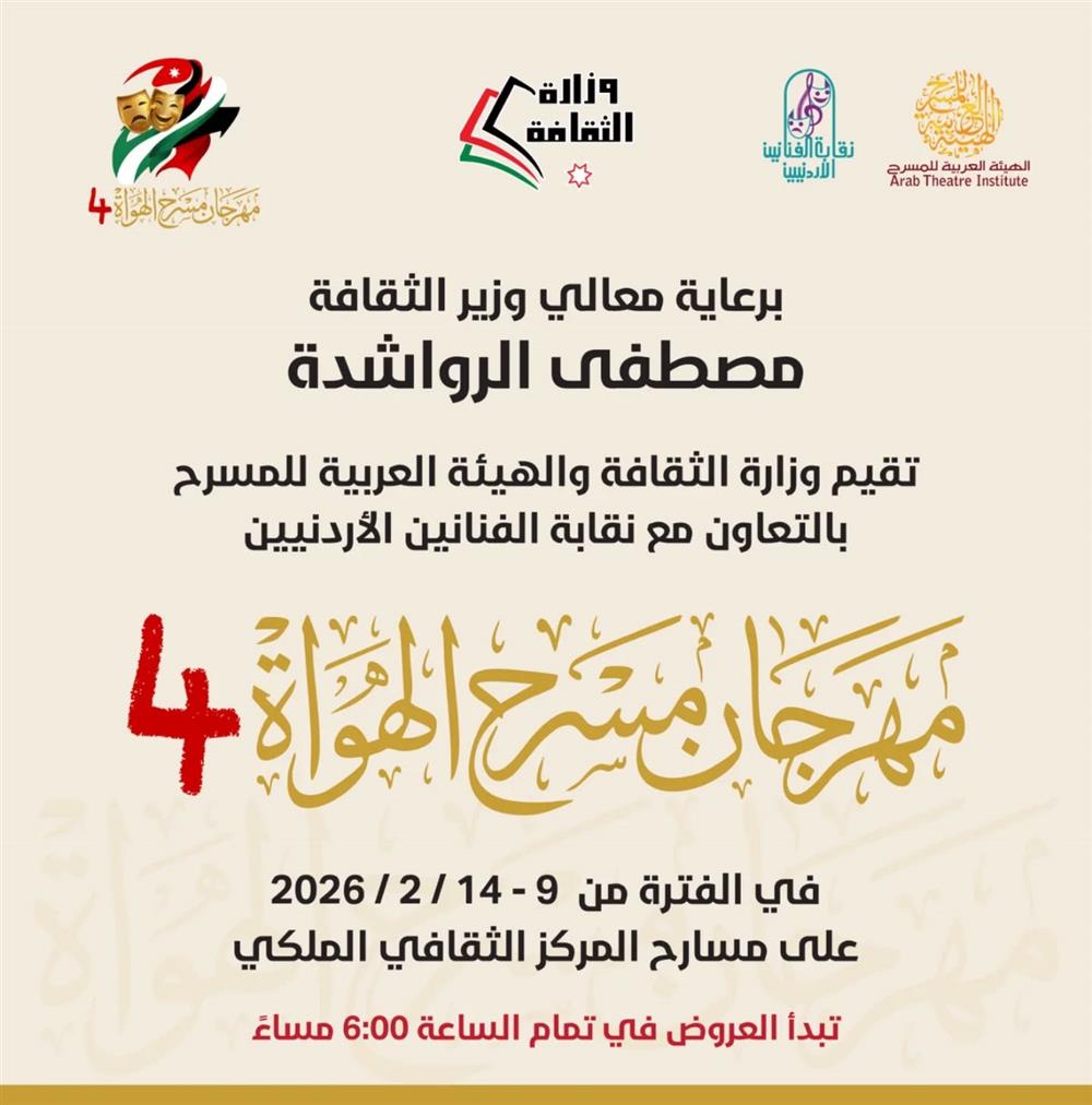 تقيم وزارة الثقافة والهيئة العربية للمسرح بالتعاون مع نقابة الفنانين الأردنيين ، الدورة الرابعة لمهرجان مسرح الهواة في الفترة من 9 ولغاية 14 فبراير 2026.