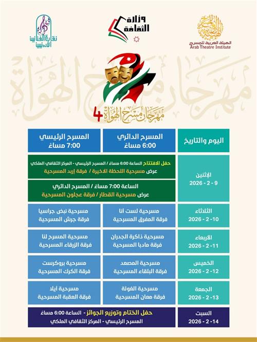 وحسب برنامج المهرجان، سيقام حفل الافتتاح يوم الاثنين 9- 2 - 2026 بالساعة 6 مساء بالمسرح الرئيسي بالمركز الثقافي الملكي، وستعرض مسرحية اللحظة الاخيرة - فرقة اربد المسرحية، في الساعة 7 مساء بالمسرح الدائري ستعرض مسرحية القطار - فرقة عجلون المسرحية، وستعرض في يوم الثلاثاء 10 - 2 - 2026 بالساعة السادسة بالمسرح الدائري مسرحية لست انا - فرقة المفرق المسرحية، وفي الساعة 7 مساء ستعرض مسرحية نبض جراسيا - فرقة جرش المسرحية بالمسرح الرئيسي، وفي يوم الاربعاء 11 - 2 - 2026 ستعرض بالساعة 6 بالمسرح الدائري مسرحية ذاكرة الجدران - فرقة مادبا المسرحية ، وعرض مسرحية المسرح لنا - فرقة الزرقاء المسرحية بالساعة 7 مساء بالمسرح الرئيسي، وفي يوم الخميس 12 - 2 - 2026 سيعرض بالساعة 6 على المسرح الدائري مسرحية المصعد - فرقة البلقاء المسرحية، وفي الساعة 7 ستعرض بالمسرح الرئيسي مسرحية بروكرست - فرقة الكرك المسرحية، وفي الجمعة 13- 2 - 2026 سيعرض بالساعة 6 بالمسرح الدائري مسرحية الغولة - فرقة معان المسرحية ، وفي الساعة 7 مساء ستعرض على المسرح الرئيسي مسرحية أياد - فرقة العقبة المسرحية، وفي يوم السبت 14 - 2- 2026 سوف يقام حفل الختام وتوزيع الجوائز بالساعة 6 مساء بالمسرح الرئيسي - بالمركز الثقافي الملكي،