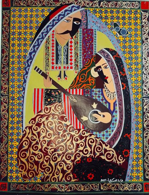 الفنانة"غادة العسكري" توظف الزخارف الإسلامية، سواء كانت أندلسية أو عثمانية أو مغاربية، في أعمالها كأدوات بصرية لنقل مشاعر معقدة ،وسرديات داخلية. أما حضور المرأة، فهو رمزي، يُجسّد الهوية والذاكرة الجماعية، بينما يمثل العود بُعدًا ثقافيًا وروحيًا، لا كآلة موسيقية فقط، بل كجسر بين الحنين والوجود.حيث لكل عنصر دور تأويلي ضمن بنية العمل، يعكس انشغالها بأسئلة المعنى والانتماء.