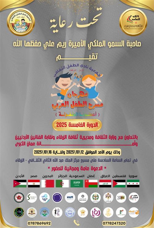 تحت شعار "اعطونا الطفولة" تنطلق مساء اليوم الاحد 12/10/2025،تحت رعاية الاميرة ريم علي ، فعاليات الدورة الخامسة لمهرجان مسرح الطفل العربي، والذي تنظمه جمعية نادي الطفل الثقافي في مركز الملك عبد الله الثاني الثقافي بالزرقاء.وذلك خلال الفترة من 12/10-16/10/2025.