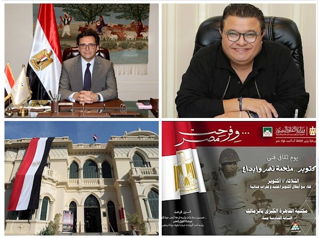تحت رعاية الدكتور أحمد فؤاد هنو وزير الثقافة، وضمن احتفالات وزارة الثقافة بالذكرى الـ 52 لانتصارات أكتوبر المجيدة تحت شعار "وفرحت مصر"، ينظم قطاع المسرح برئاسة المخرج خالد جلال، يوم ثقافي فني بعنوان "أكتوبر ملحمة نصر وإبداع" فى السادسة من مساء يوم الثلاثاء 7 أكتوبر الجاري، بمكتبة القاهرة الكبرى بالزمالك بإشراف الأستاذ يحيى رياض .